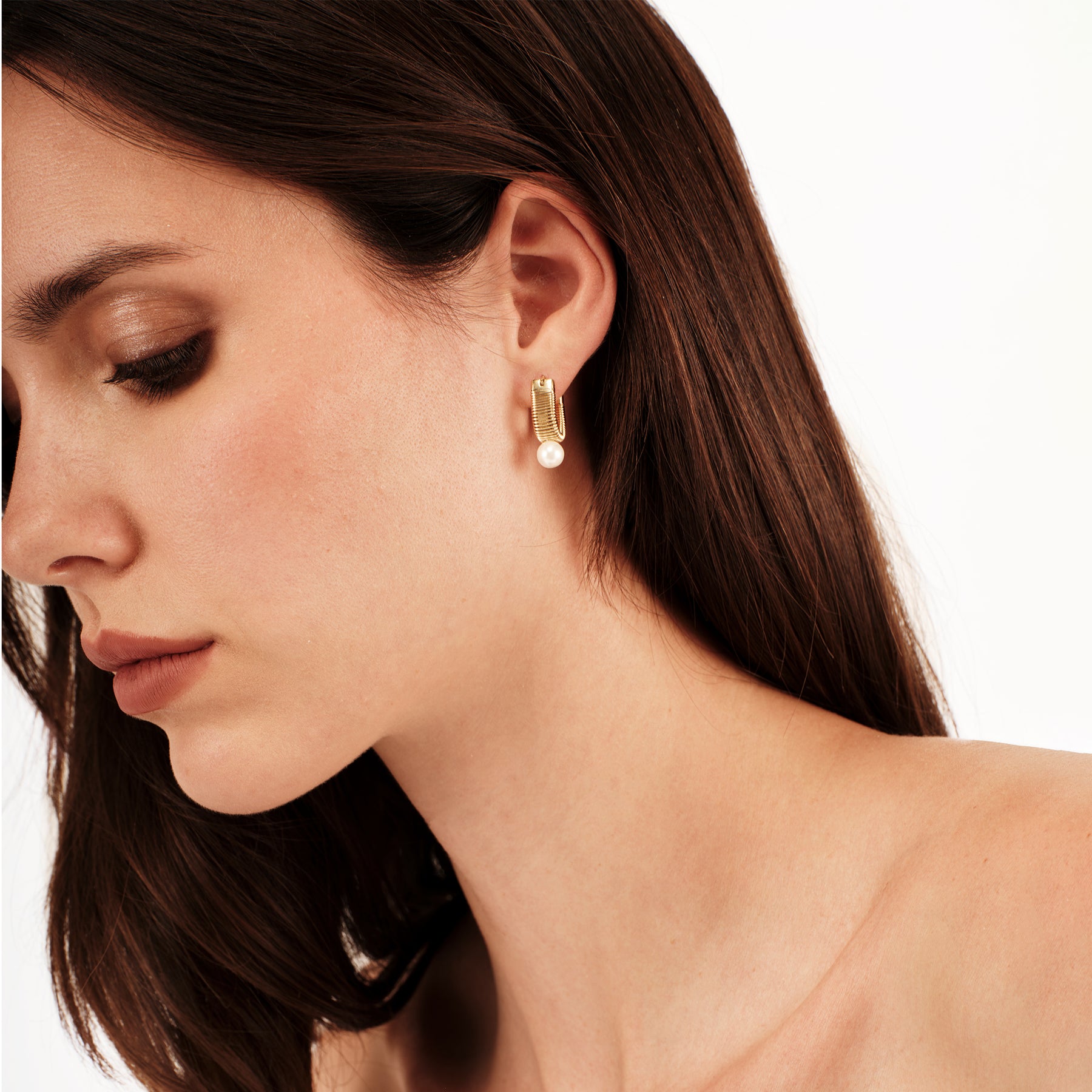 أقراط Stylize عبارة عن حلقات من الفولاذ الذهبي ذات تأثير أنبوبي، ومزينة بقلادة من عرق اللؤلؤ. يضمن إغلاق الحربة ملاءمة عملية وآمنة، بينما تسمح الأحجام السرية بالارتداء اليومي.
