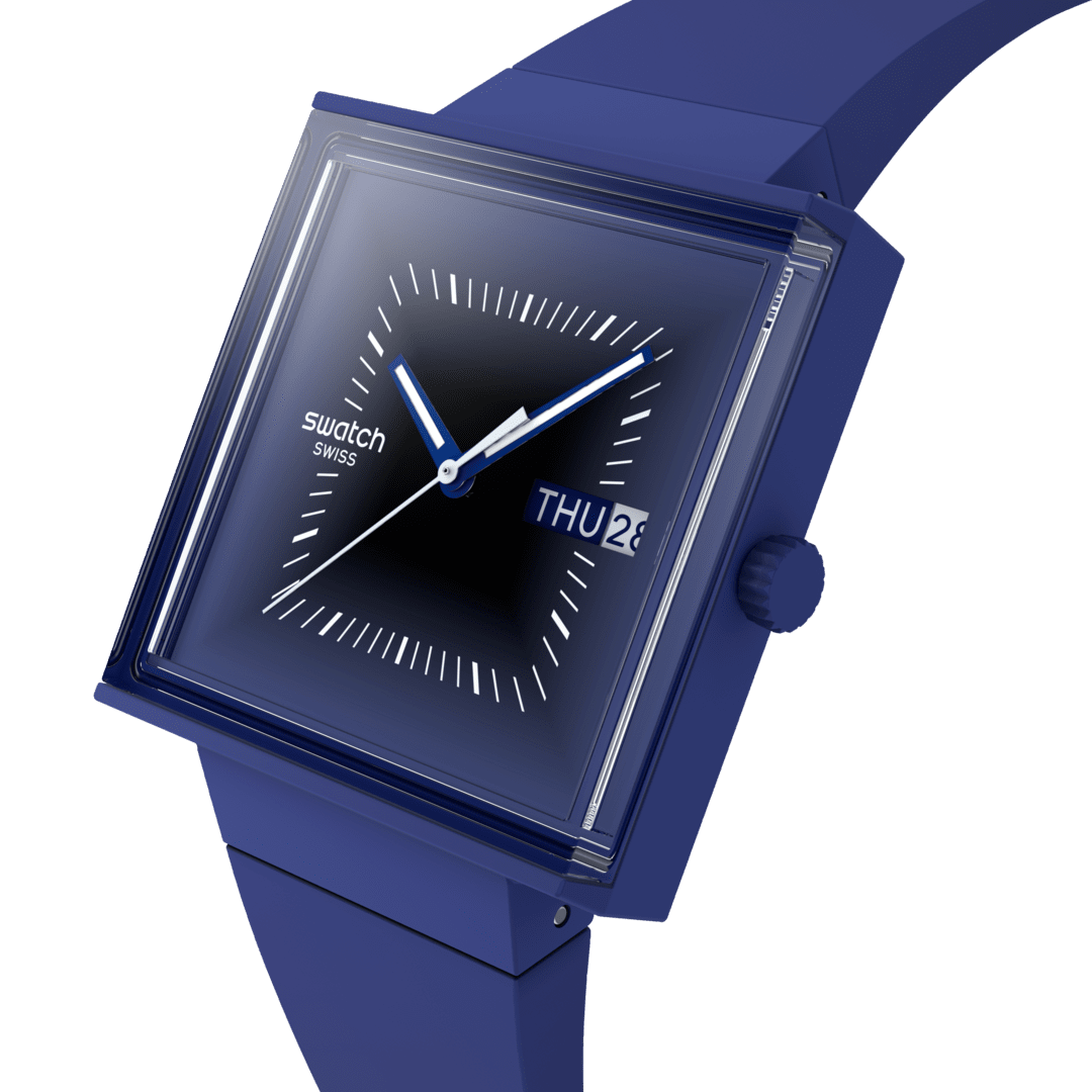 La cassa quadrata in Bioceramic blu scuro opaco è dotata di un vetro biosourced edge-to-edge che offre una vista laterale della minuteria stampata in azzurro. Il quadrante quadrato, nero e blu scuro sfumato, presenta lancette delle ore e dei minuti blu scuro con effetto fosforescente, una lancetta dei secondi azzurra e un datario blu scuro e azzurro a ore 3. Il quadrante e la cassa sono completati da un cinturino blu scuro e nero opaco e sfumato, con passante blu scuro opaco e fibbia blu scuro opaco.