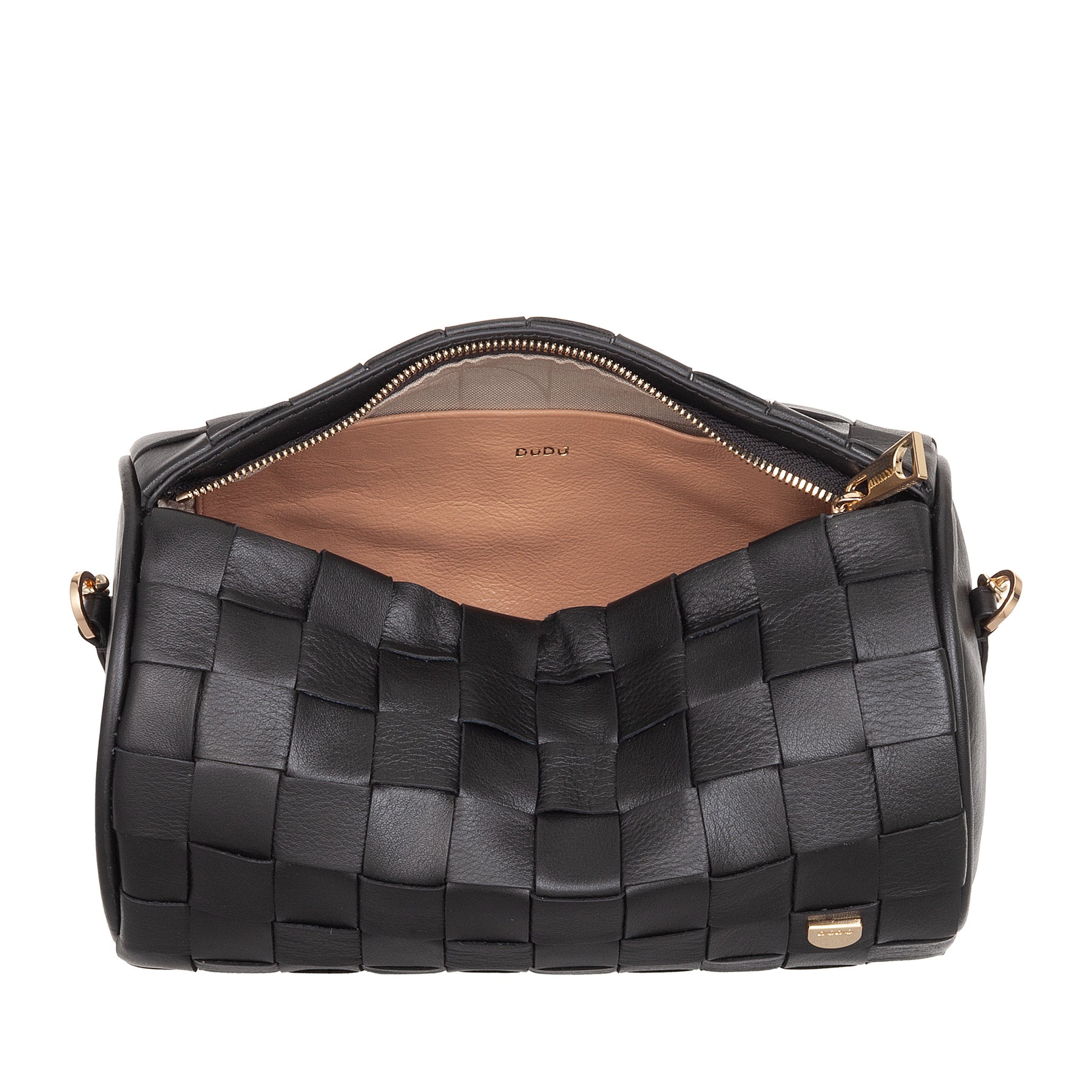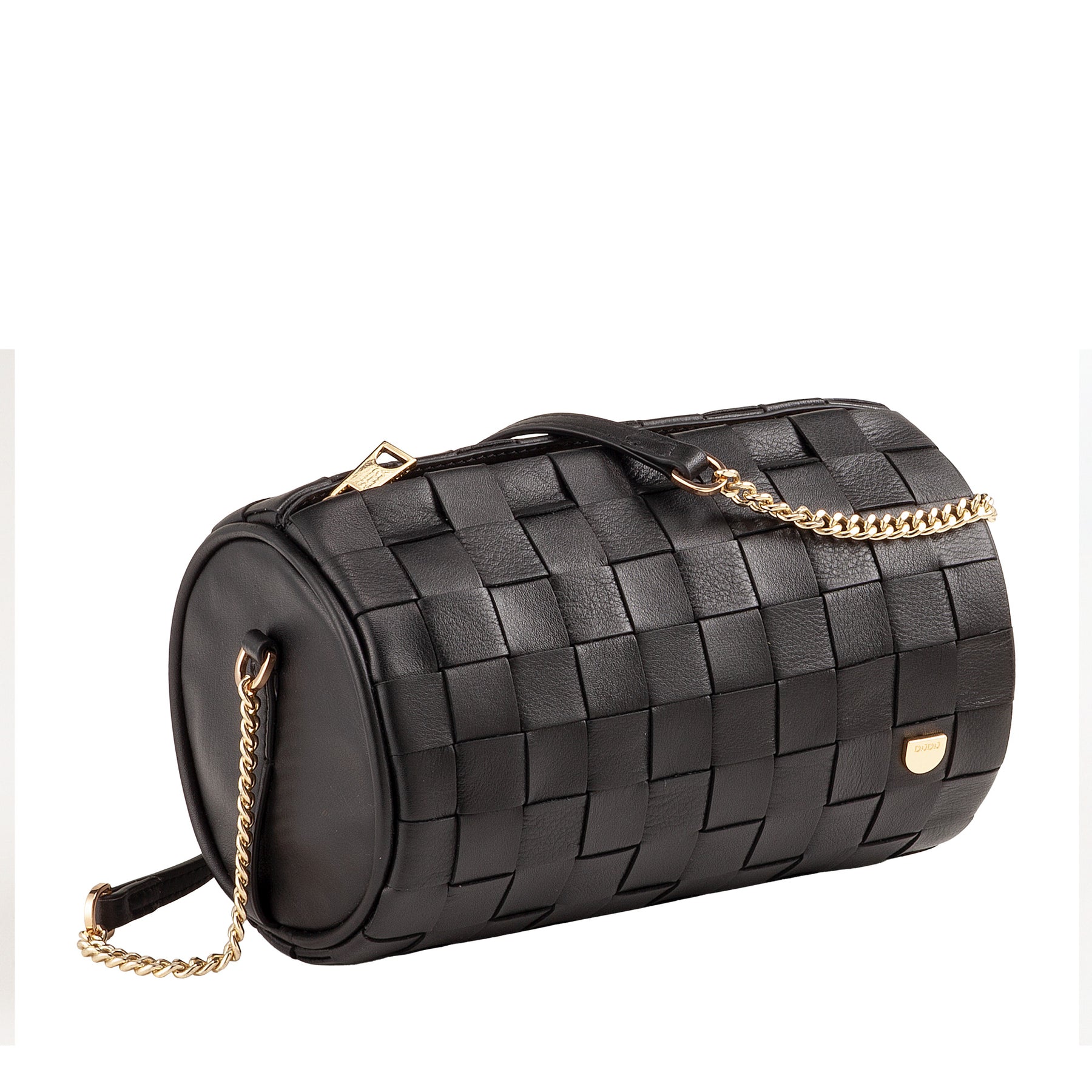 Ein originelles und raffiniertes Design, das Modernität und handwerkliche Tradition kombiniert. Dieser ehrwürdige Zylinder in echtem miteinander verflochtenem Leder ist nach seiner einzigartigen Form, die jedem Outfit Charakter und Stil verleihen kann. Der dünne Schultergurt mit einer goldenen Kette verleiht zeitgenössischer Eleganz, während die kompakte, aber große Struktur es Ihnen ermöglicht, alle wichtigen Wesentlichen mit praktischer Bedeutung mitzunehmen. Der Reißverschluss garantiert Sicherheit, und die Innenräume mit Liebe zum Detail machen dieses Modell sowohl für den Tag als auch für den Abend perfekt. Ein hoch entwickeltes und vielseitiges Accessoire, das für die Frau entwickelt wurde, die gerne mit einzigartigen Details und zeitlosen Designs abhebt.