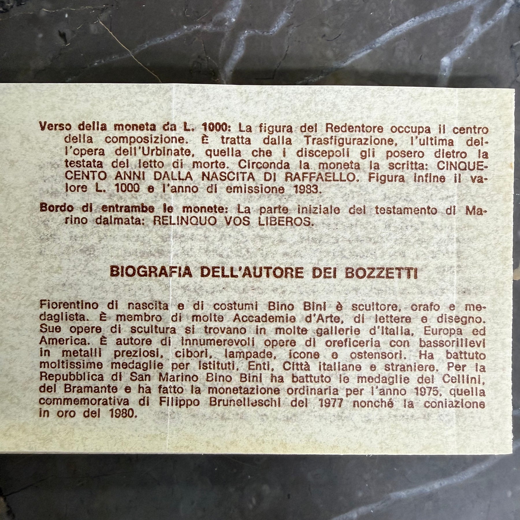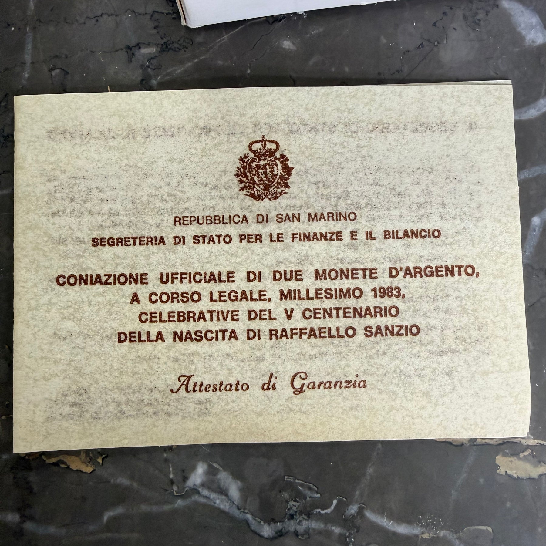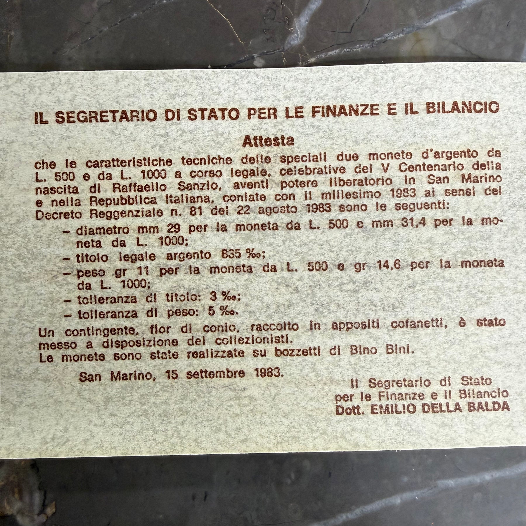 Paar Gedenkmünzen aus 835‰-Silber, geprägt von der Republik San Marino im Jahr 1983 anlässlich des fünfhundertsten Geburtstags von Raffaello Sanzio. Die 500-Lire-Münze wiegt 11 Gramm bei einem Durchmesser von 29 mm, während die 1000-Lire-Münze 14,6 Gramm bei einem Durchmesser von 31,4 mm wiegt. Beide sind gesetzliches Zahlungsmittel in San Marino und Italien. In unzirkuliertem Zustand erhalten, präsentiert in der Originalverpackung. Von Sammlern italienischer historischer Numismatik gesuchte Stücke.