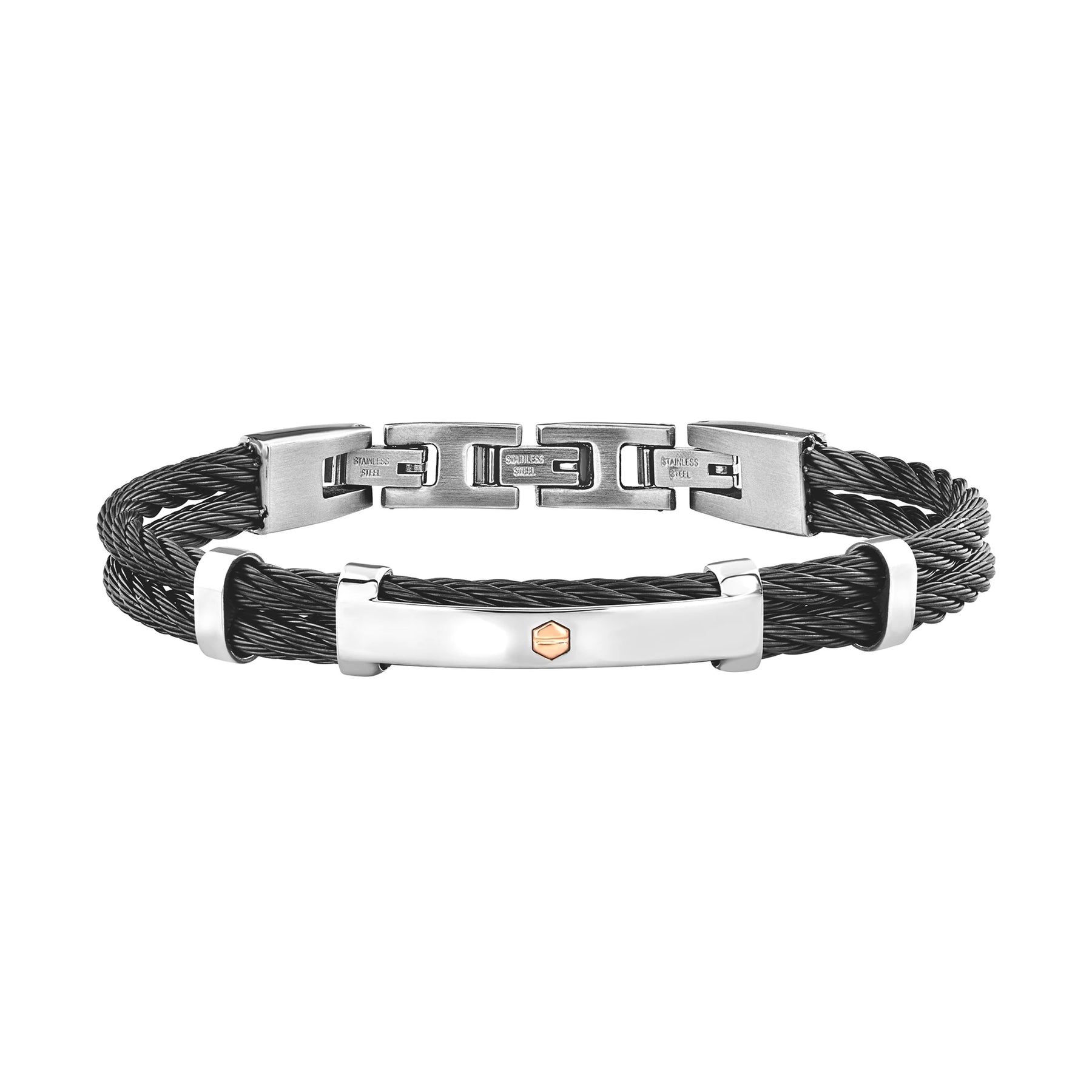 The 9K loop bracelet is characterized by two thin gun -colored steel cables, enriched by a central element Silver decorated with a 9k gold hexagonal screw. The jewelry closure envelops the pulse naturally, completing the design with a perfect balance between essentiality and modernity.