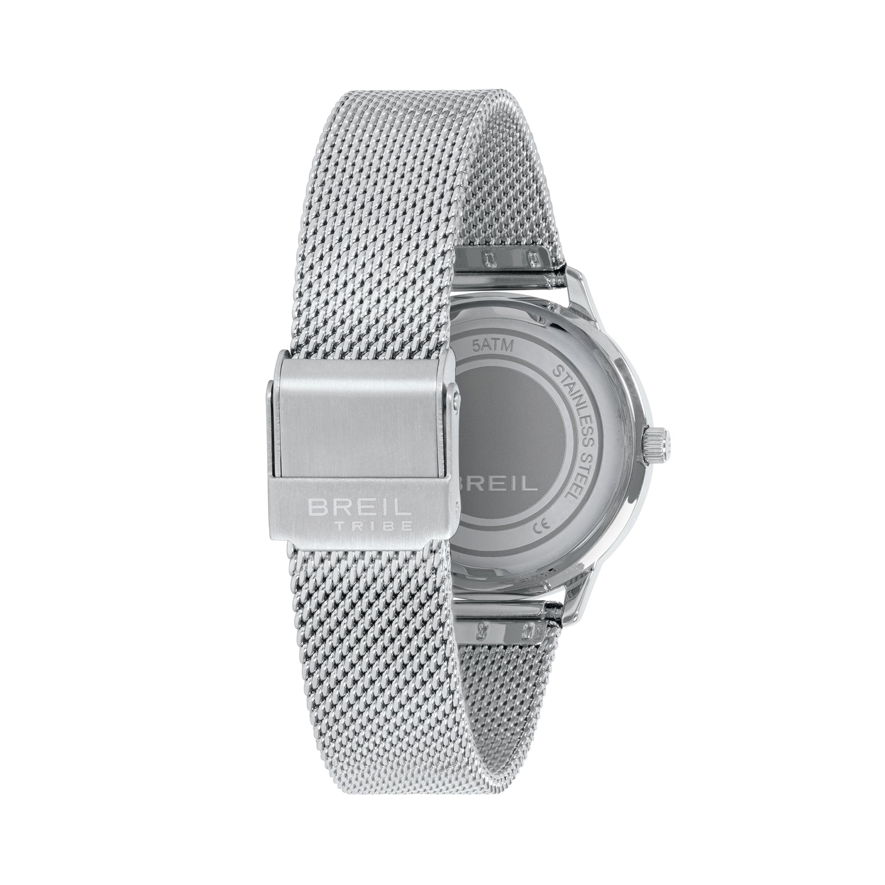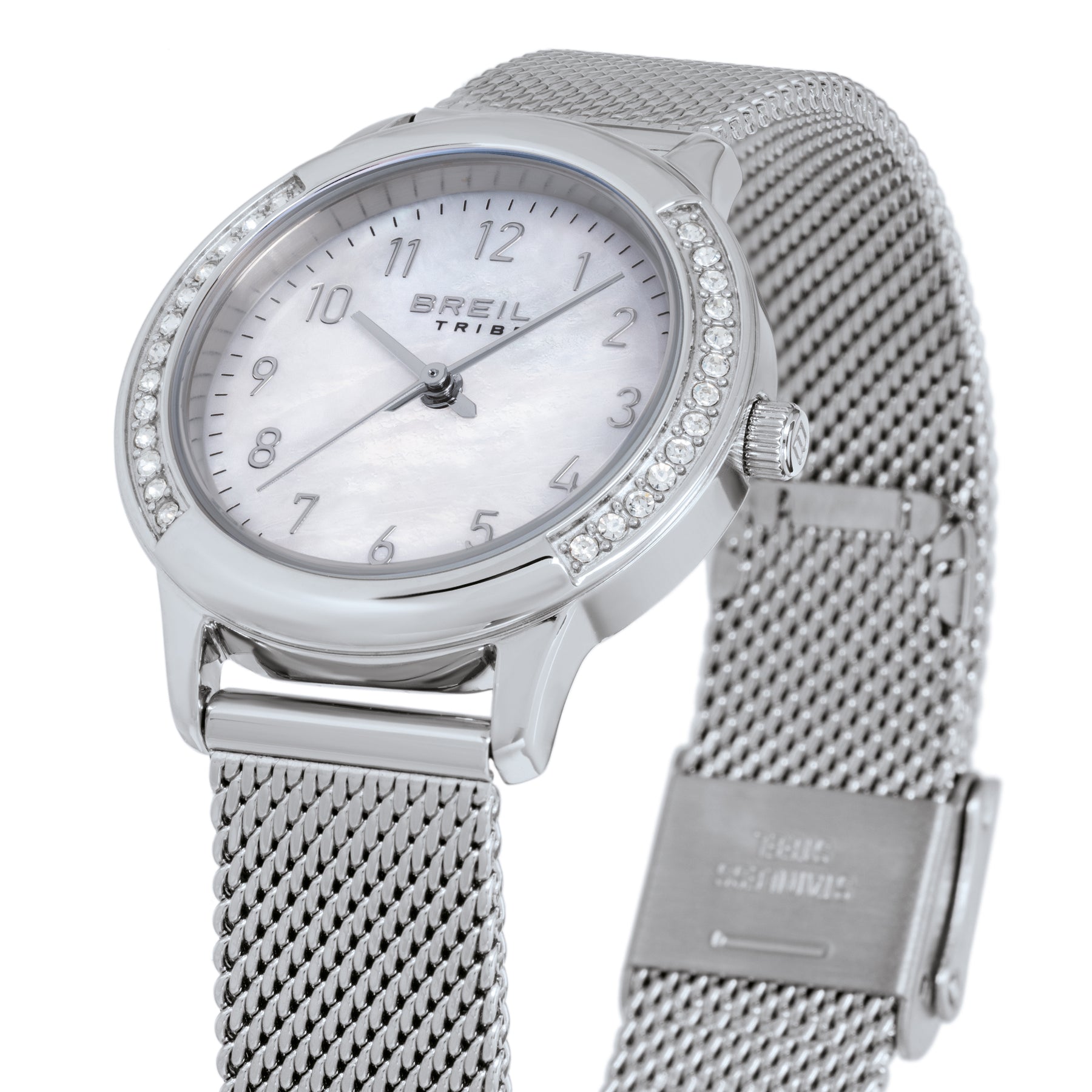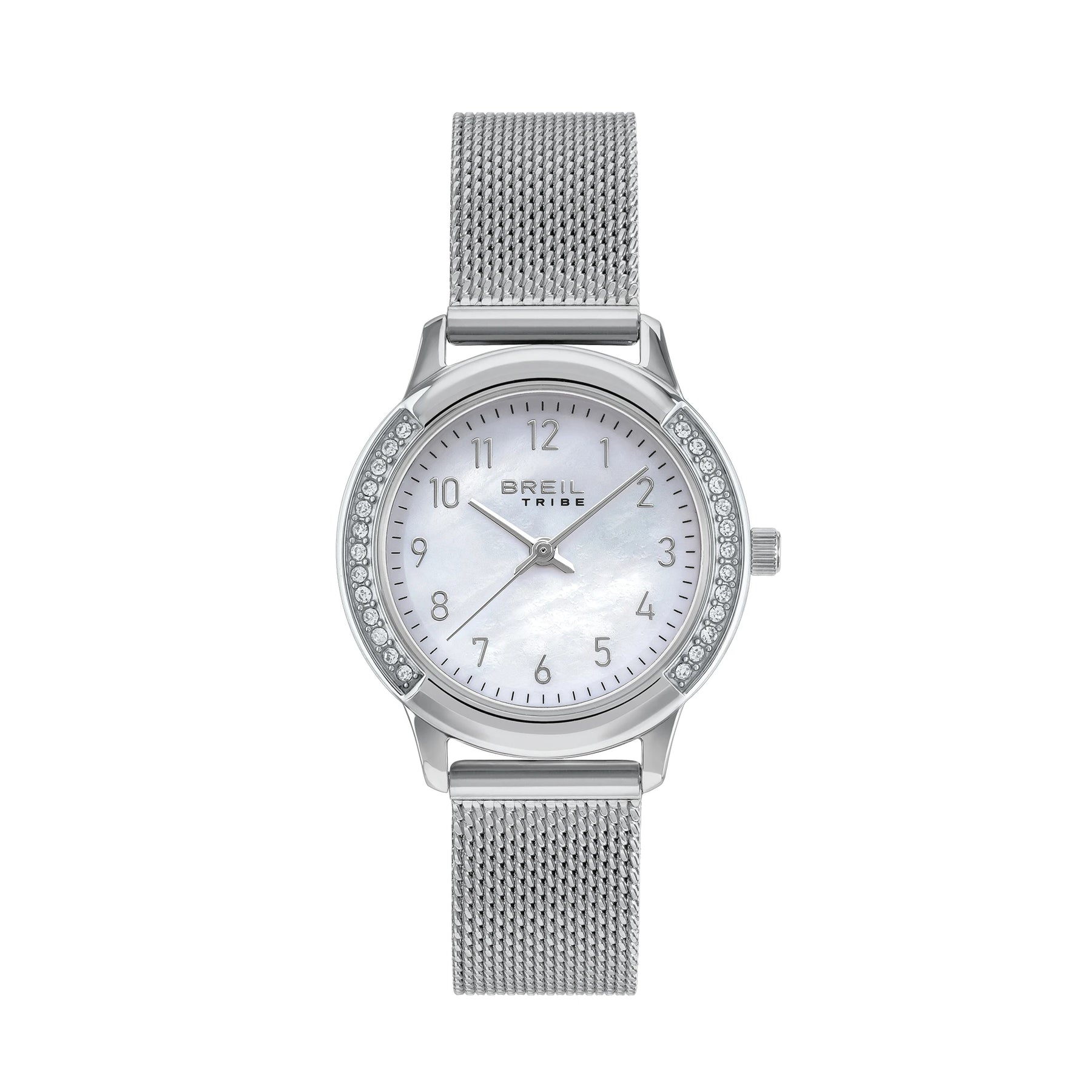 The Eye To Eye women's watch stands out for its contemporary design. Made of steel, it has a mesh knitted bracelet and a mother -of -pearl dial, framed by a shiny lunette embellished with a crystal pavé. The indices with Arabic numerals, combined with the Silver spheres, complete the design with a classic but always current detail.