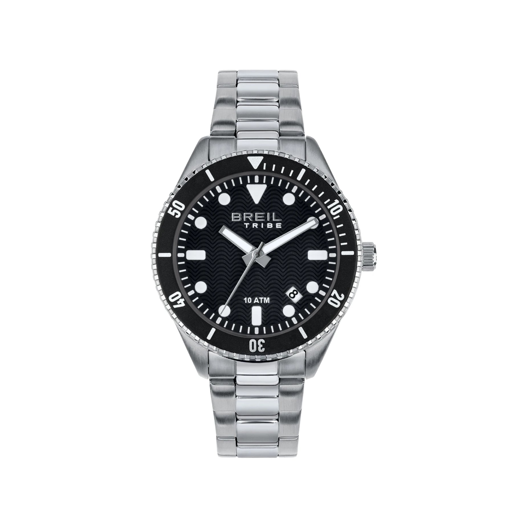 The Overhand men's time clock takes inspiration from the marine environment. Steel case and bracelet are combined with a black dial with relief patterns that simulates the movement of the waves, illuminated by contrasting white details and combined with the lunette of the same color. The shiny and satin Bilux finish of the bracelet enriches this style clock.