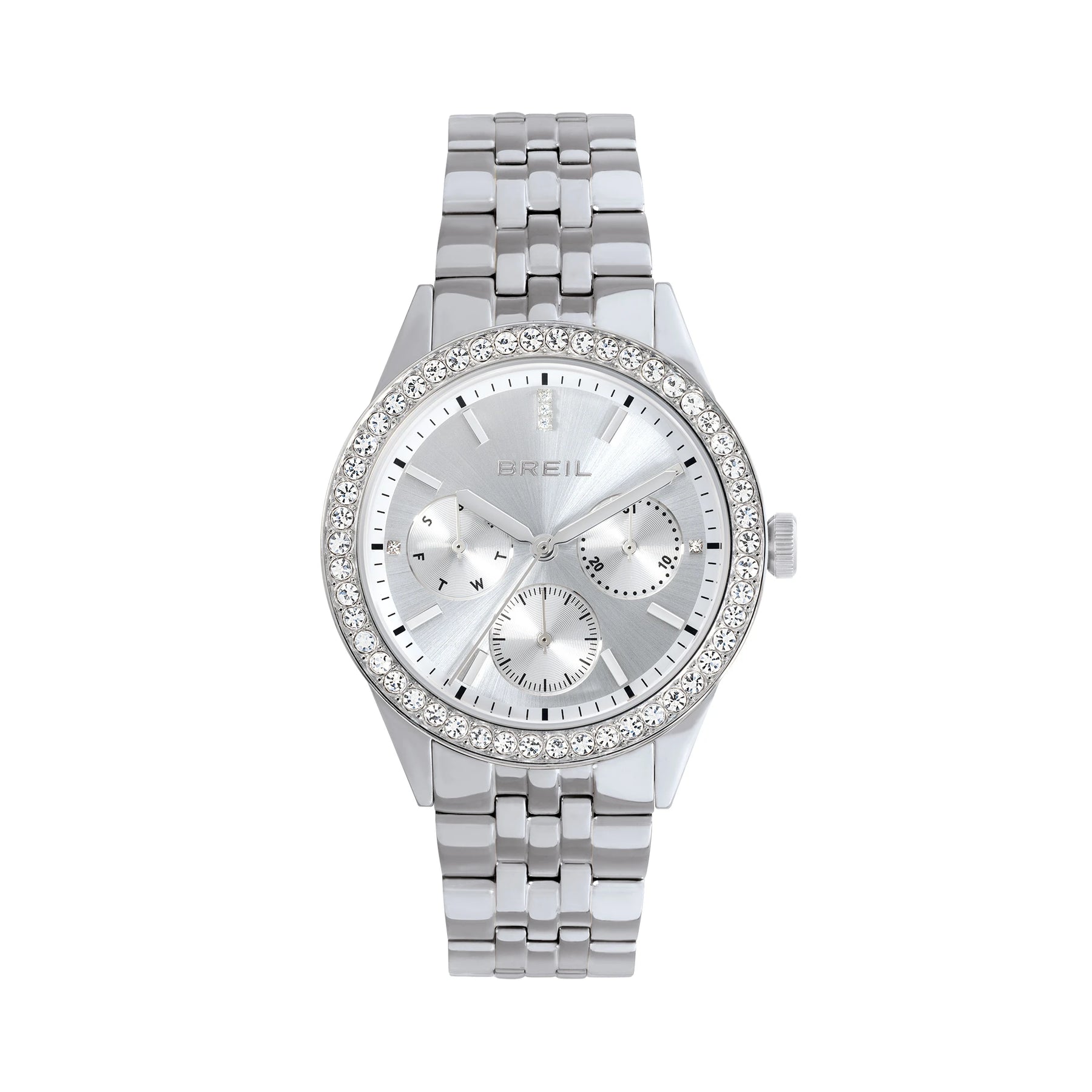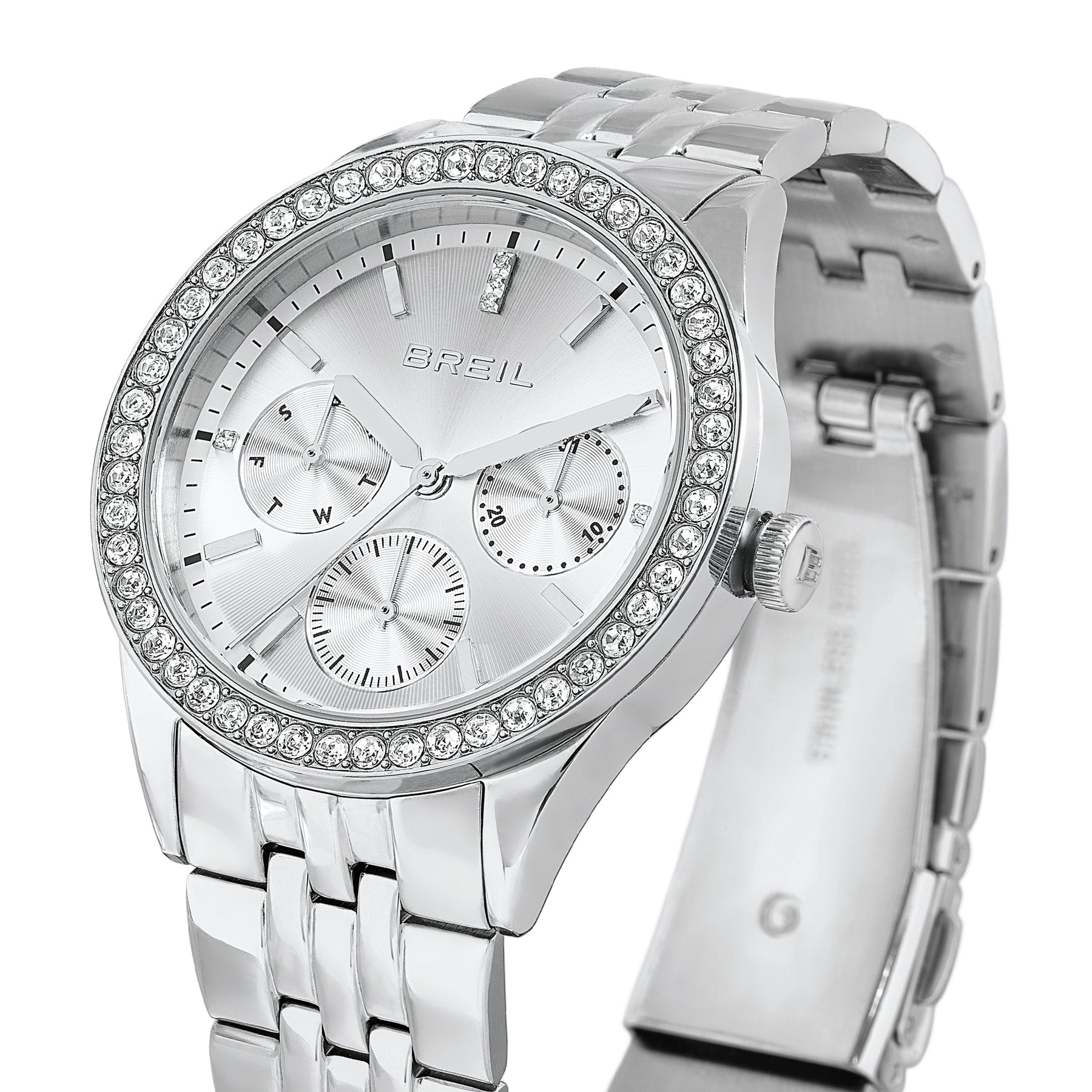 The chronograph for women flurry in polished steel stands out for the bezel embellished with a pavé of white crystals and for the silver color dial with Sunray effect that captures the light at each movement. Silver indices are enriched with crystals positioned at 12, 3 and 9, giving a touch of discreet brilliance. Elegant and versatile, it is perfect combined with an evening look or a structured blazer for a day look.