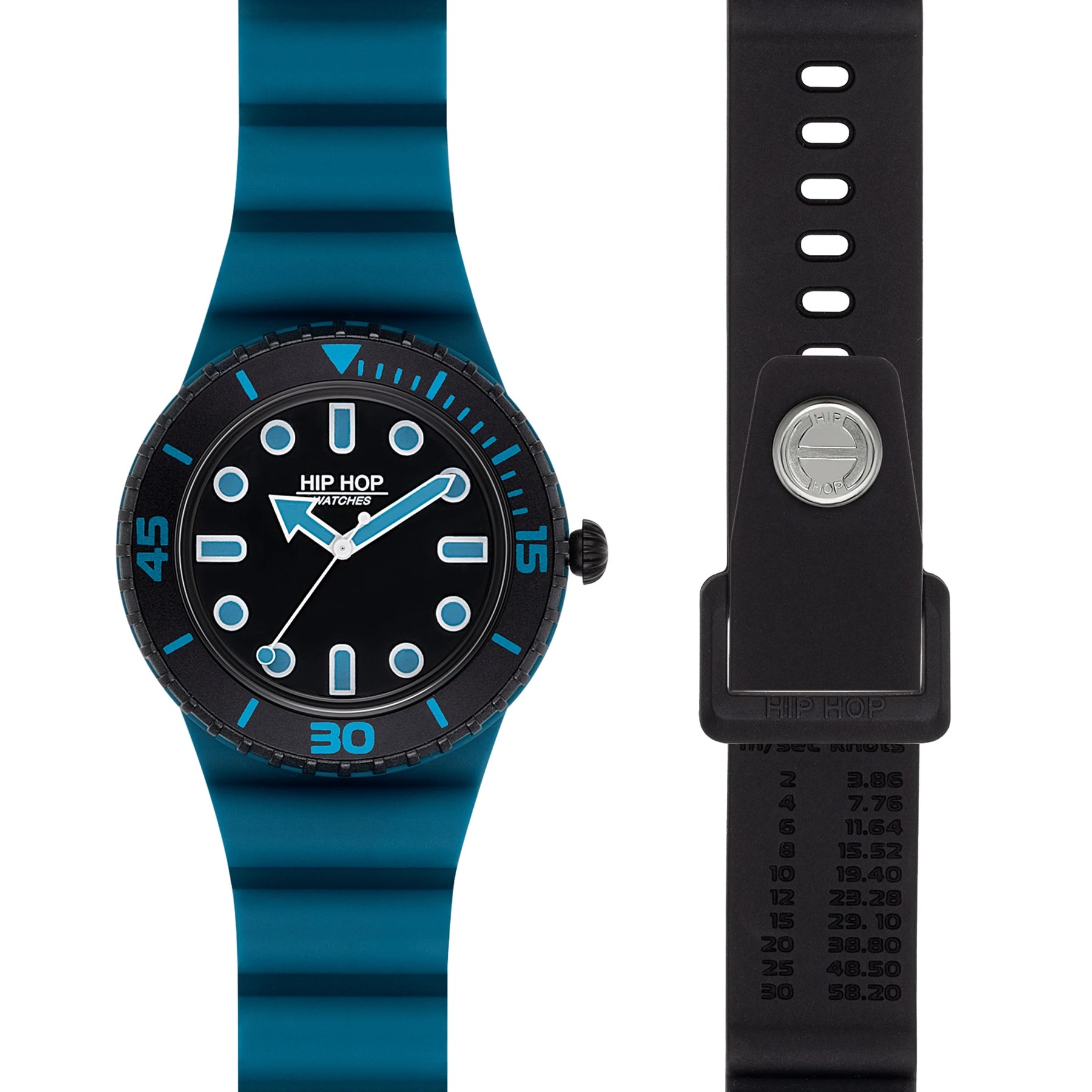 The Hip Hop Master watch is a perfect mix of style and practicality, suitable for facing any daily challenge with energy and precision. The dial is illuminated by the numbers and spheres with contrasting blue luminous with the color of the case and the unidirectional swivel lunette, for an combination of character. The soft blue euthel silicone strap has the .Dot closure and has impressed a special detail: the Wind Speed, conversion scale from meters to second to knots to indicate the wind speed. The clock is sold with a second interchangeable black silicone strap to always be taught with the mood of the day.