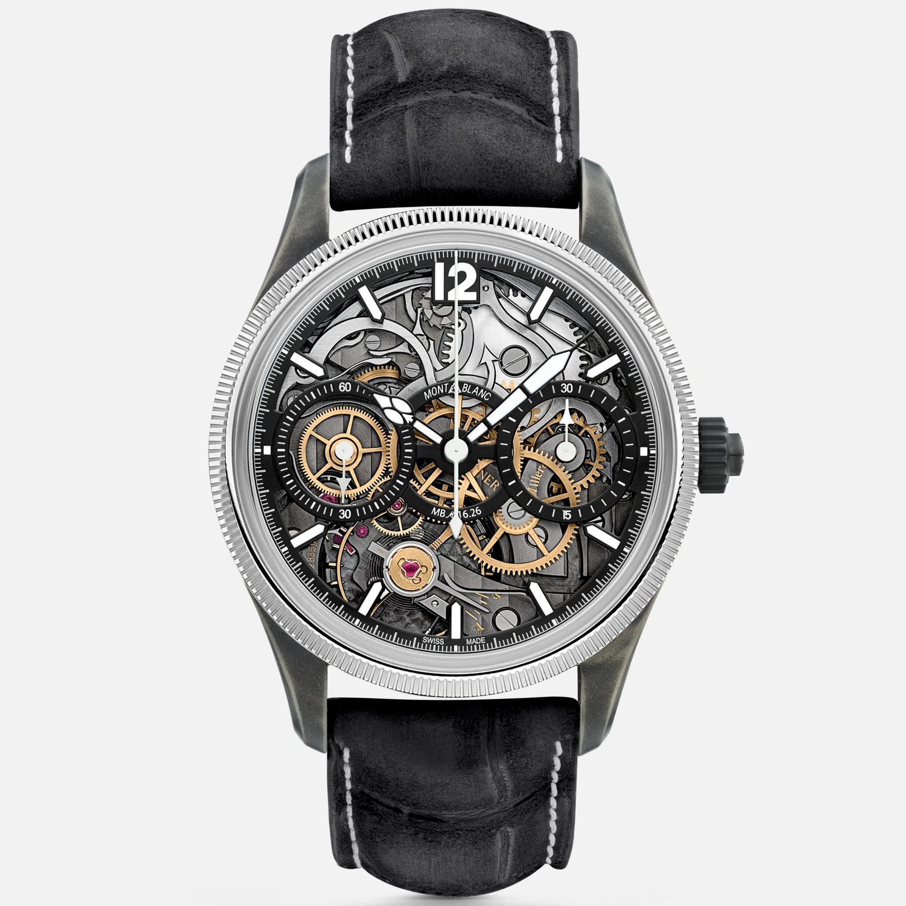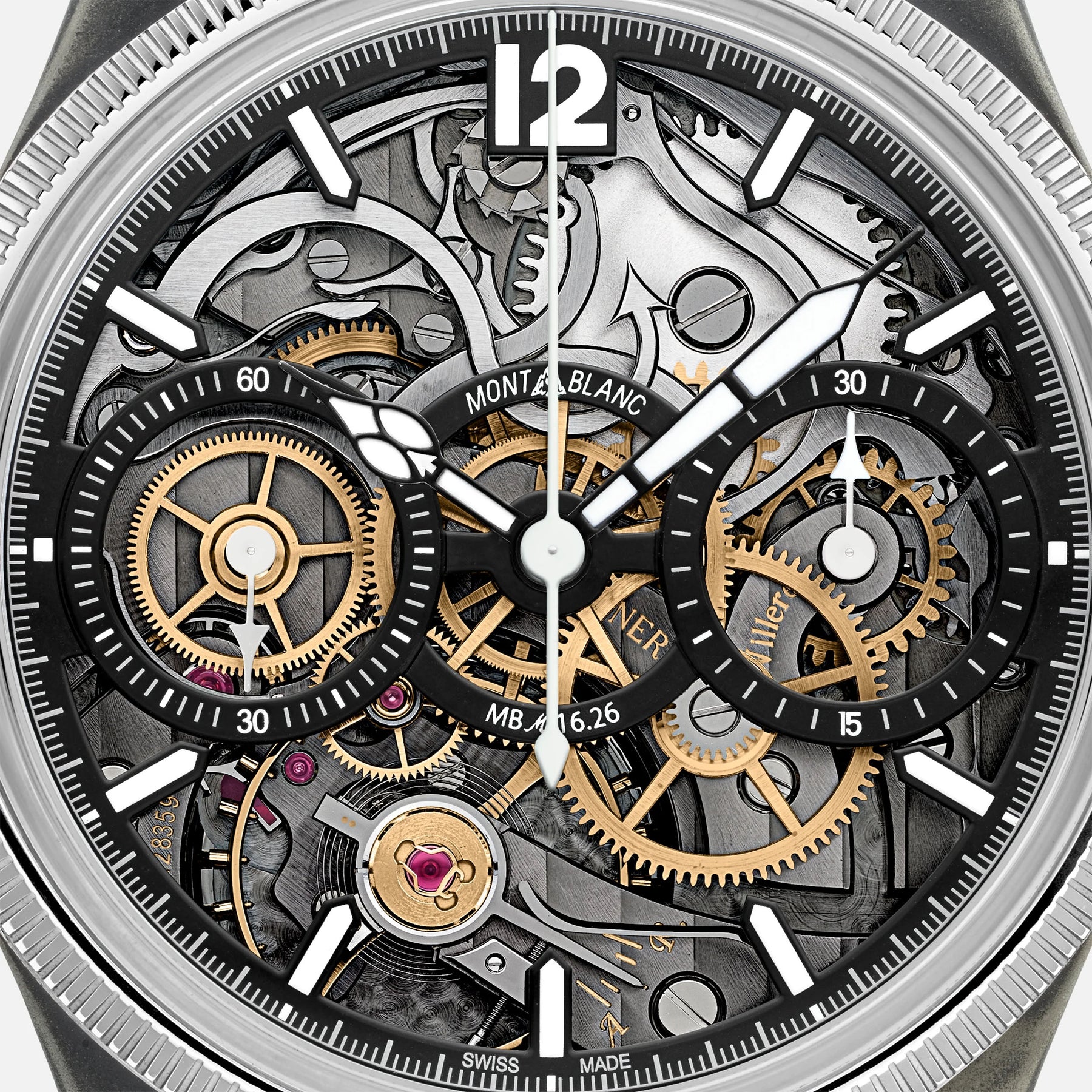 The Montblanc Unveiled Secret Minerva Monopusher Chronograph limited edition allows you to admire the caliber of manufacturing Montblanc MB M16.29 which has been reversed to reveal all the magic of the chronograph movement. Toping a movement seems simple, but requires a remarkable technical feat since it is also necessary to reverse the direction of the hands. This limited edition of 88 specimens is available with a 43 mm anti -white precious steel case and grooved lunette in white gold and has a black Nabuk alligator strap with a triple black finishing steel buckle with refined adjustments with refined adjustments