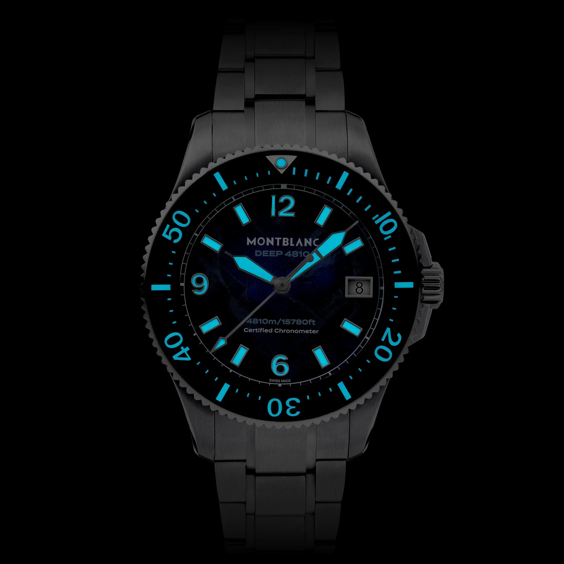 After reaching the highest peaks, Montblanc explores the sea depths of up to 4810 meters with Montblanc Iced Sea 0 Oxygen Deep 4810. The green dial "glacier" is inspired by the Mer de Glace ("sea of ice"), the main glacier of the Mont Blanc massif. His texture was obtained using an almost forgotten ancestral technique called Gratté-Boisé. With 43 mm titanium case completely oxygen free with screw crown protective shield, this dive watch has a background with 3D incision of the diving view under the ice. The timepiece is animated by the MB 29.29 automatic movement of manufacture with Ca Ca Ca Ca Ca Create and charge reserve of about 5 days, in accordance with ISO 6425 legislation for underwater diving. It is waterproof up to 4810 meters.