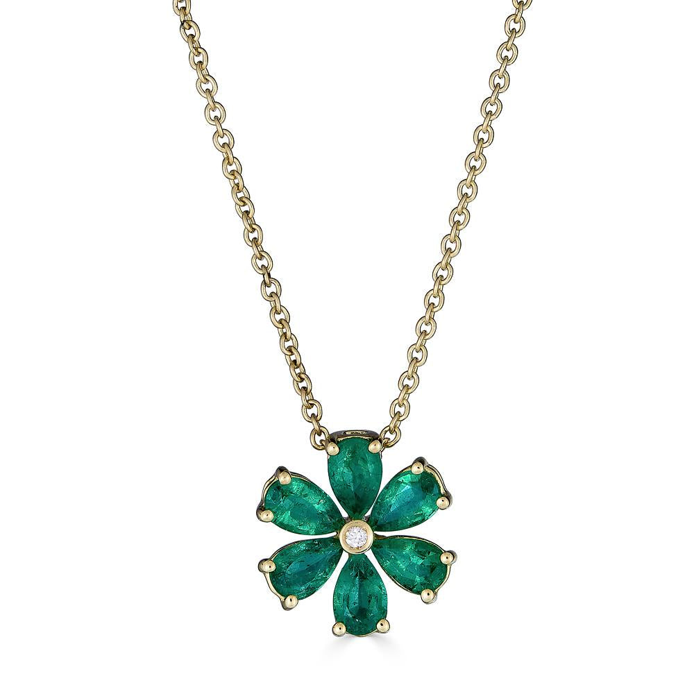This stunning diamond and gemstone flower pendant is set in 18K gold. Six pear-shaped gemstones combine with a central round white diamond to create a stunning flower shape. Diamond Quality: F Color, VS Clarity Diamond Carat Weight: 0.01 Gemstone Variant Information: Yellow Sapphire Carat Weight: 1.73 Green Emerald Carat Weight: 1.22