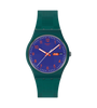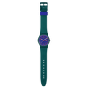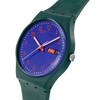 This watch has a blue dial testurized with orange printed numbers, blue -printed minutes and orange and darot to 3 hours. Under the Biosourced glass, the time is indicated by orange hours and minutes that light up in the dark and from a hands of the second blue seconds. The opaque dark green case is completed by a testurized opaque dark green strap, a matte blue passerby and a opaque dark green buckle.
