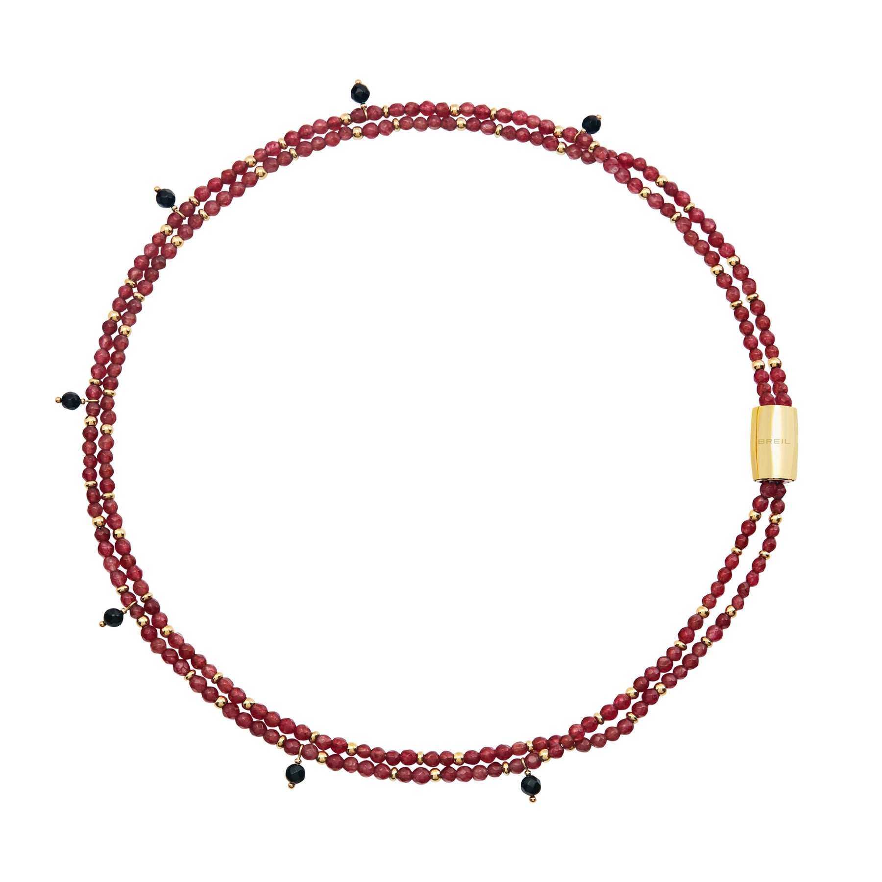 Magnetica System is the jewelery collection which, thanks to its different elements and magnetic closures, can be modified and take on ever-changing shapes and styles. The Red Carpet choker is made up of two red agate chains, enriched with gold-coloured steel micro spheres and 7 black agate charms. It can be worn alone or combined with any other element of the collection, to create new necklaces of different lengths.