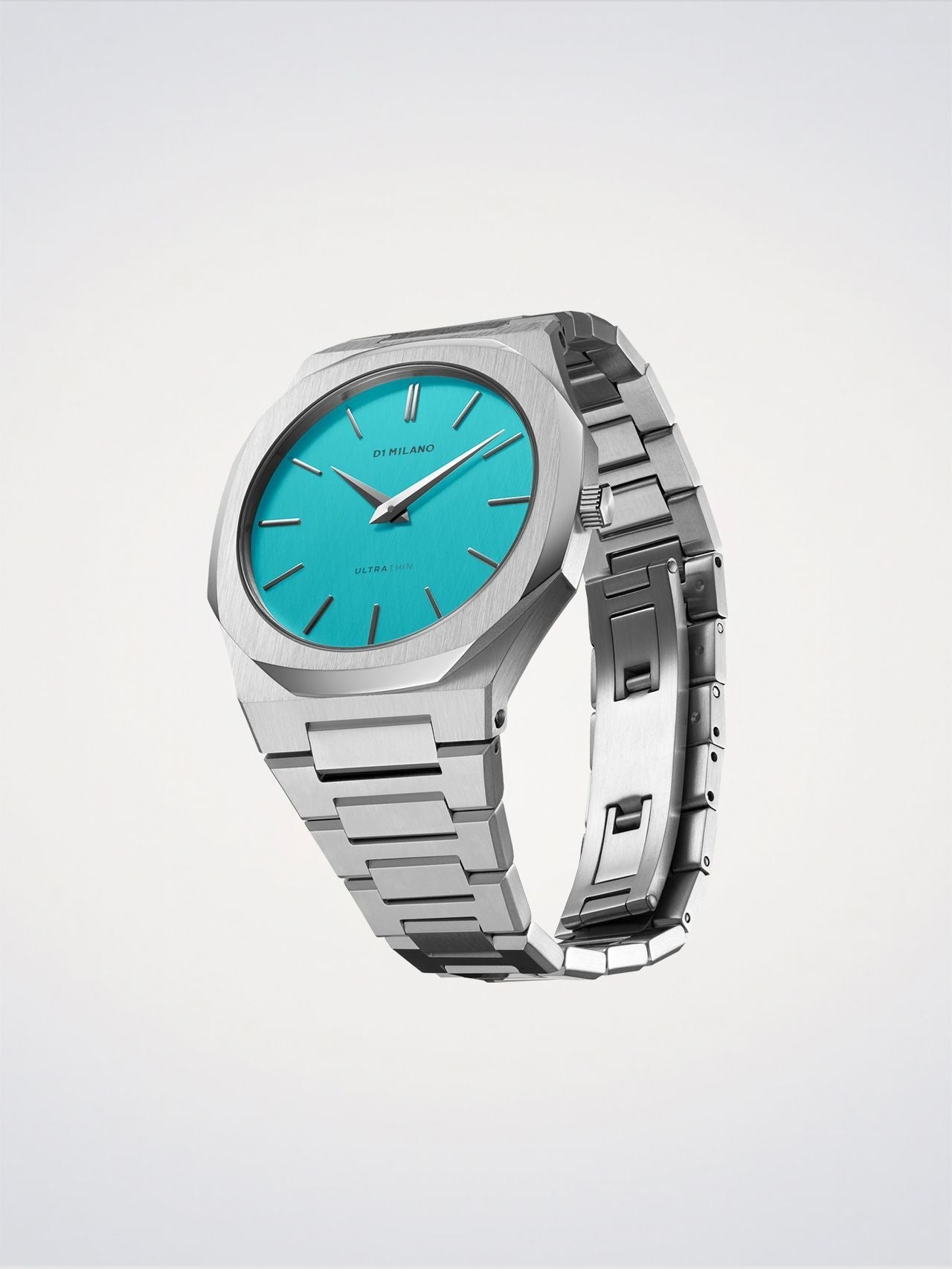 The Ultra Thin Bracelet - Light Blue model features the first light blue dial among the 38mm models, maintaining the shape and features of the collection, such as the iconic 6mm thick 316L stainless steel case.