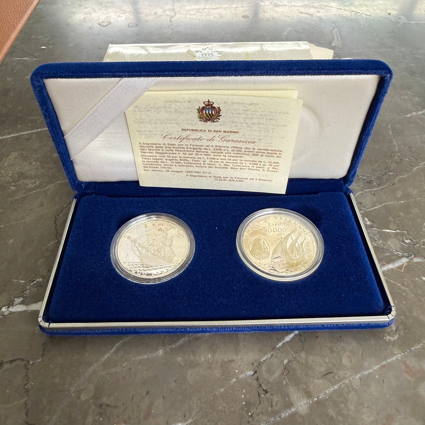 Reverse of the 10,000 Lira coin: The composition depicts the ship used by Amerigo Vespucci in his travels with, on the left, an image of the navigator. At the top are the legends AMERIGO VESPUCCI / LIRE / 10000, at the bottom is the name of the author of the sketch and the engraver.