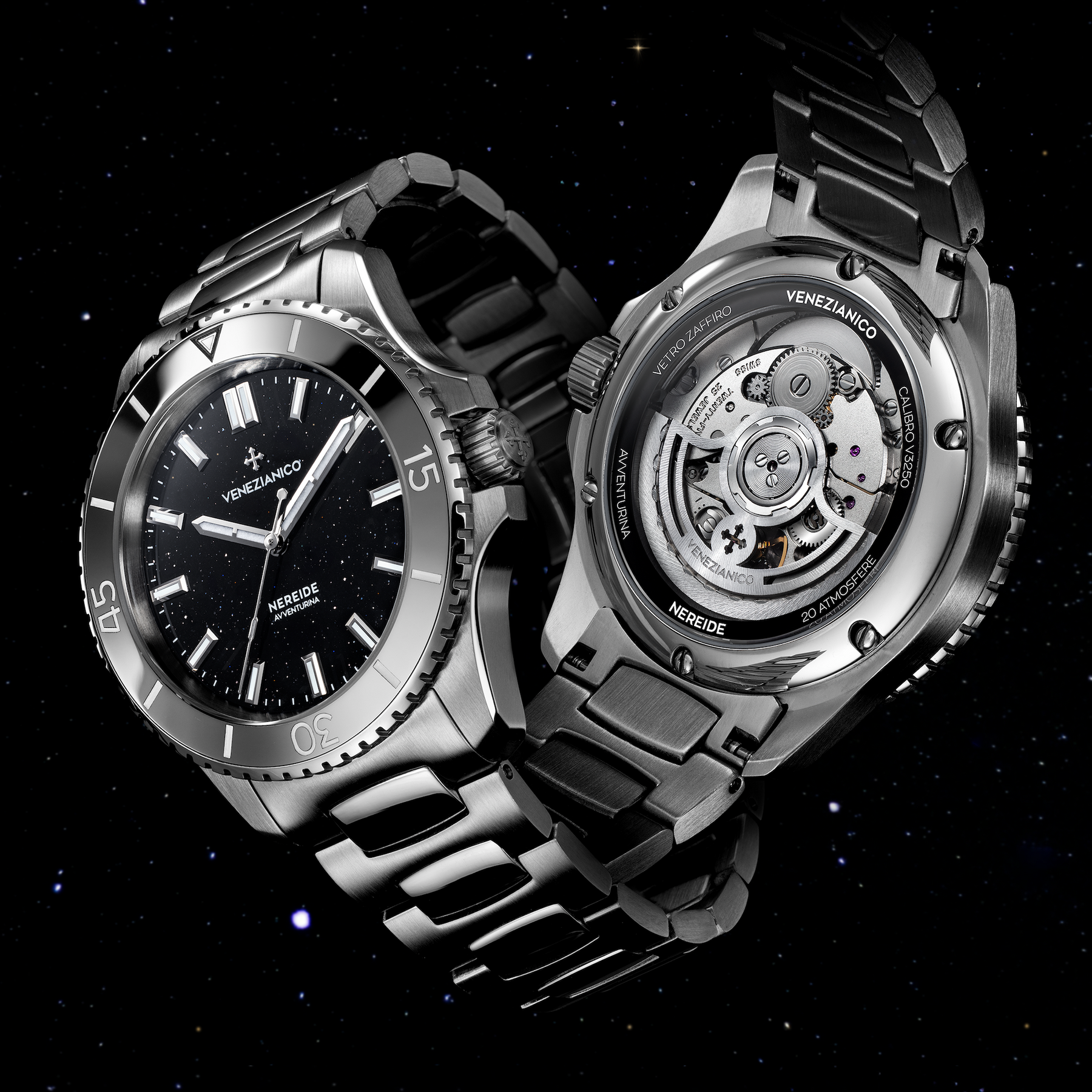 This Nereide takes its name from the adventurine, a particular processing of the glass invented in Venice in the seventeenth century and which is characterized by the particular needlefish metal microinclusions. These produce a multitude of sparkling reflections reminiscent of the stars of the night sky.