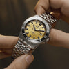 Aurean Nereide is a diving watch that blends elegance and innovation. Its dial, adorned with a 24k pure gold treatment with a yearless finish, evokes the ancient Venetian art of lamination. The robust 316L steel case, combined with a tungsten bezel, integrates perfectly with the new Sansovino bracelet, characterized by shiny and satin shirts and a micro-regulation closure that guarantees solidity and maximum comfort on the wrist.