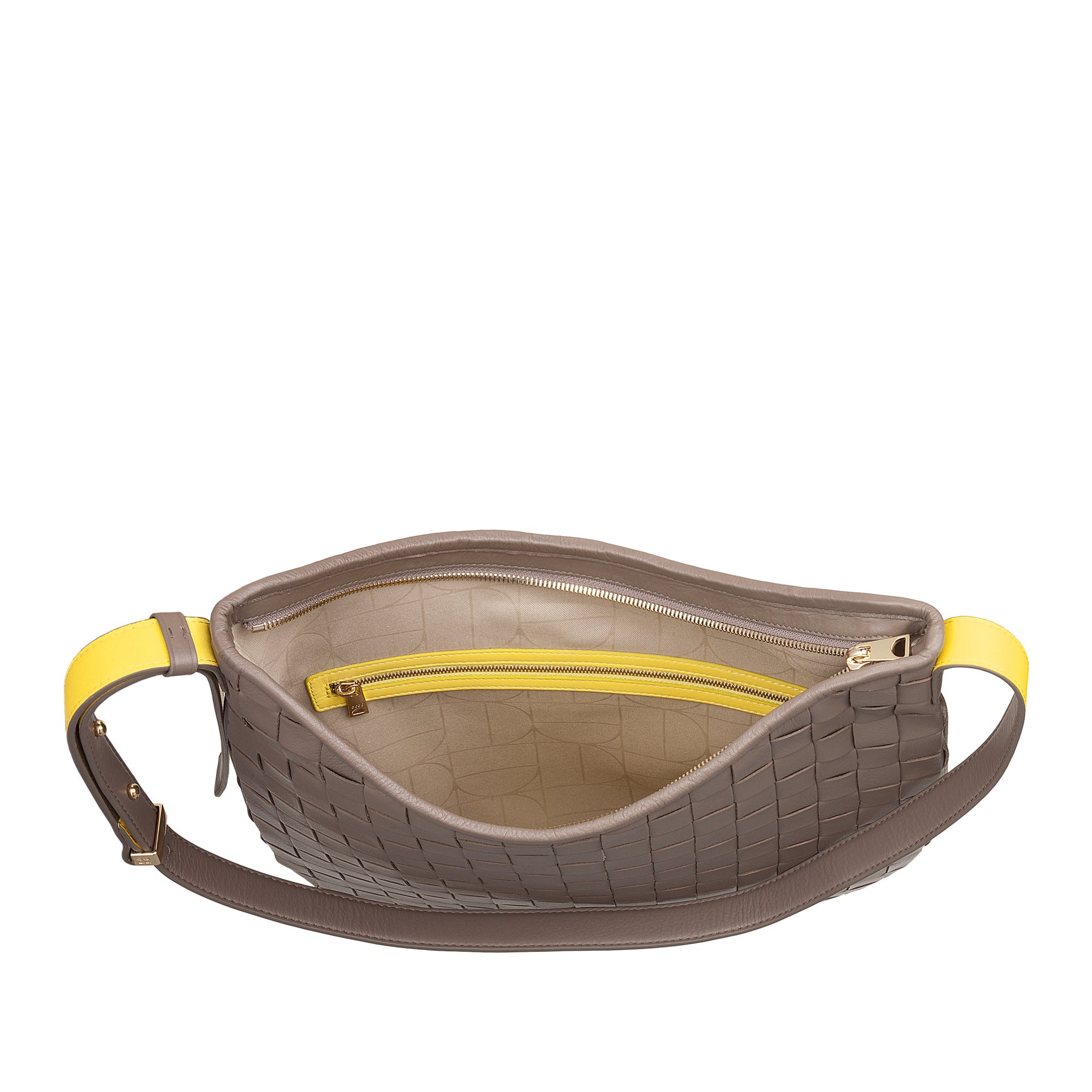 La elegancia atemporal cumple con la practicidad diaria. Esta bolsa de vagabundo en cuero tejido real es un accesorio refinado y versátil, diseñado para acompañarlo en cualquier momento del día. Su forma suave y grande se adapta perfectamente al estilo dinámico de aquellos que buscan comodidad y clase en una sola solución. Equipado con mango ajustable, se puede llevar cómodamente al hombro, ofreciendo practicidad sin sacrificar estilo. El espacioso interior, con bolsillos prácticos y cierre de cremallera, le permite organizar mejor sus efectos personales. Un sofisticado imprescindible, ideal para la mujer a la que le encanta destacarse con detalles artesanales y diseño contemporáneo.