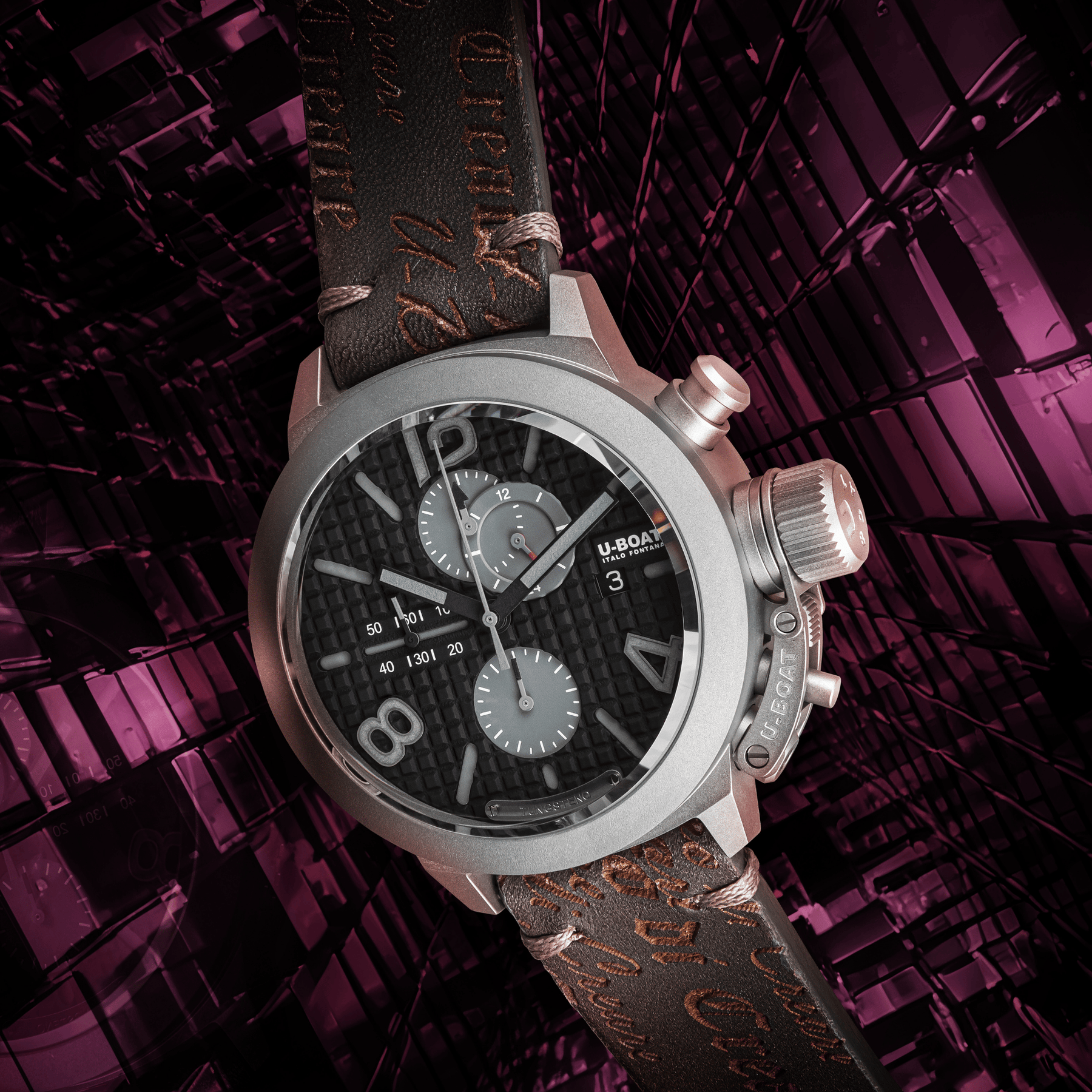 動き U-BOAT仕様に技術的改良を加えた機械式自動巻きクロノグラフ。周波数 28,800 振動/時間、4 Hz。パワーリザーブ62時間。ルビー25個。スケルトン化されたローター。 SW500セリタ。
