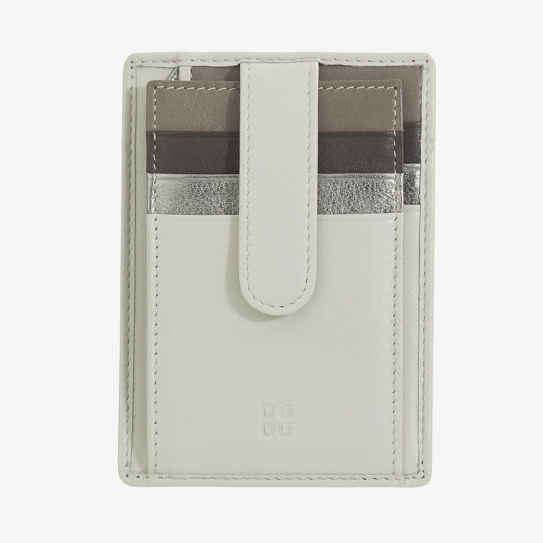 부드러운 천연 송아지 가죽 소재의 멀티컬러 신용카드 지갑입니다. 여러 개의 신용카드 포켓과 외부 잠금 스트랩. 서류나 지폐를 넣을 수 있는 주머니 2개. 항상 휴대할 수 있는 다용도의 컴팩트한 유니섹스 액세서리입니다.