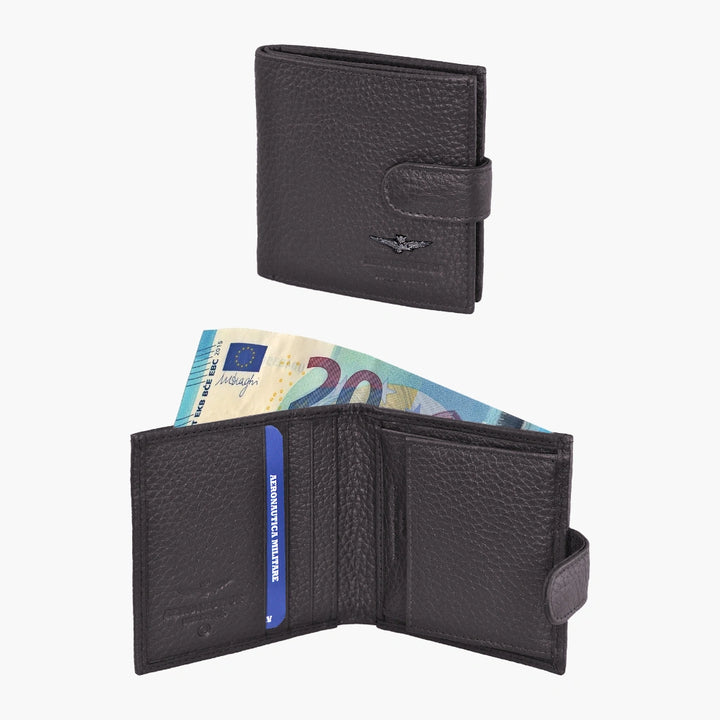 Portafoglio tascabile in vera pelle morbida con porta spicci, caratterizzato dall’aquila in metallo e marchio a fuoco Aeronautica Militare . Il particolare pellame rende il portafoglio comodo da portare in tasca, ma al tempo stesso non rinuncia alla resistenza e all'eleganza della vera pelle