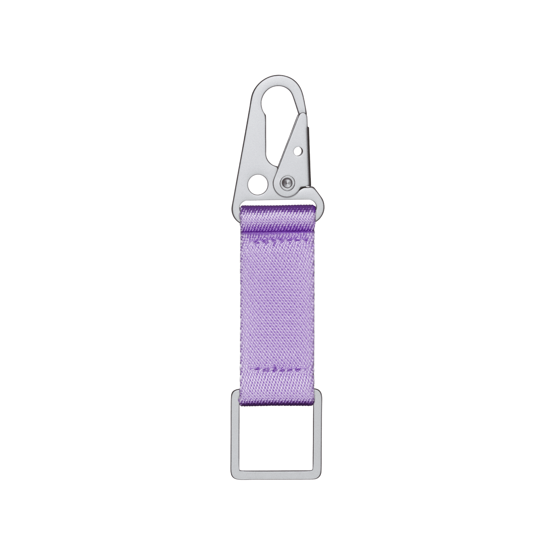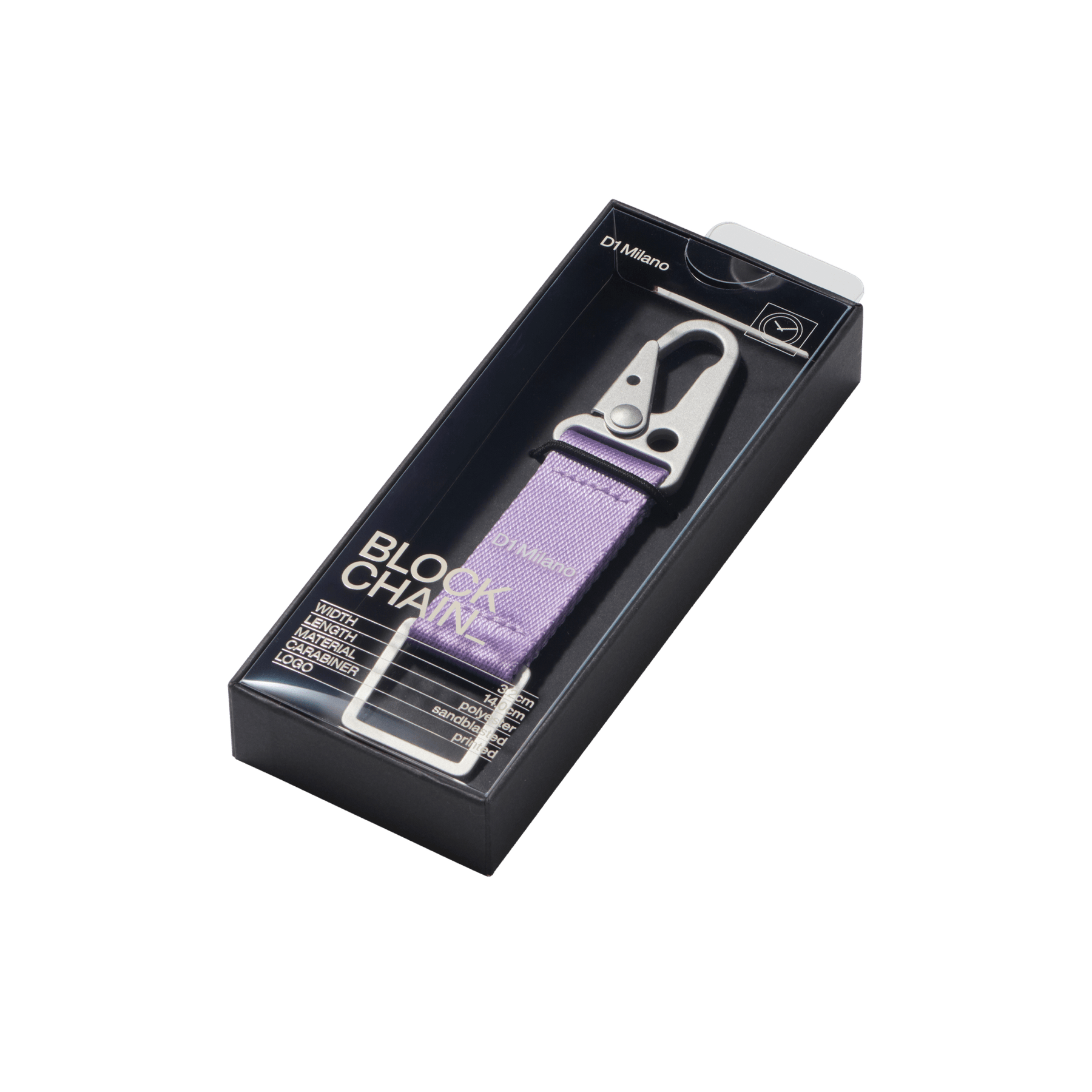 O novo porta-chaves D1 Milano é um prático acessório feito de nylon lilás com logotipo branco e prático gancho em aço prateado.