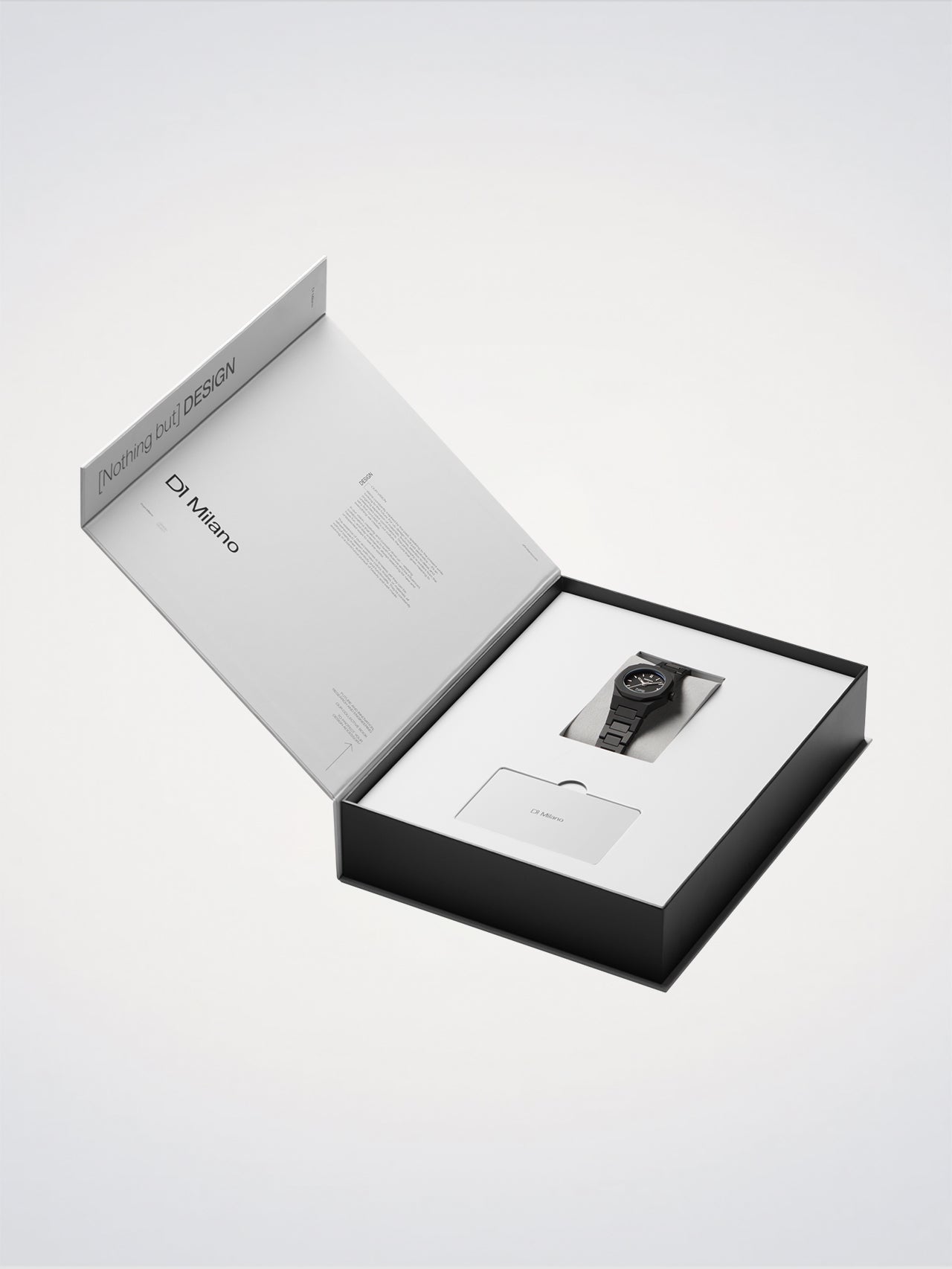 Este relógio com caixa de policarbonato de 32 mm apresenta mostrador em latão preto e vidro mineral anti-reflexo. A pulseira integrada é contornada para um ajuste preciso, resultando em uma silhueta moderna e monocromática otimizada para pulsos menores.