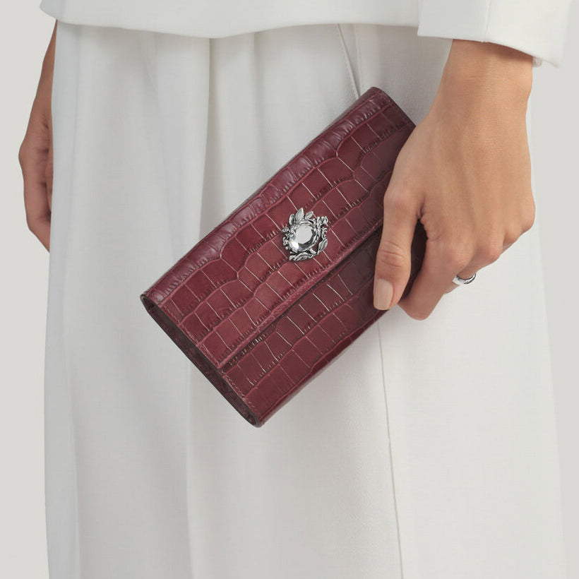 Um acessório elegante e atemporal, esta carteira é feita à mão em couro croco bordô: um couro de bezerro brilhante de alta qualidade, trabalhado para reproduzir com refinamento a textura do crocodilo. Elegante e funcional, oferece uma organização impecável graças a seis compartimentos para cartões, dois grandes bolsos de fole para notas e um espaçoso bolso para moedas com fecho de correr. A aba central, embelezada com um fecho de joia em bronze branco representando um leopardo pousado sobre um grande cristal incolor de corte oval facetado, alberga um bolso adicional que corresponde a um compartimento simétrico no lado oposto.