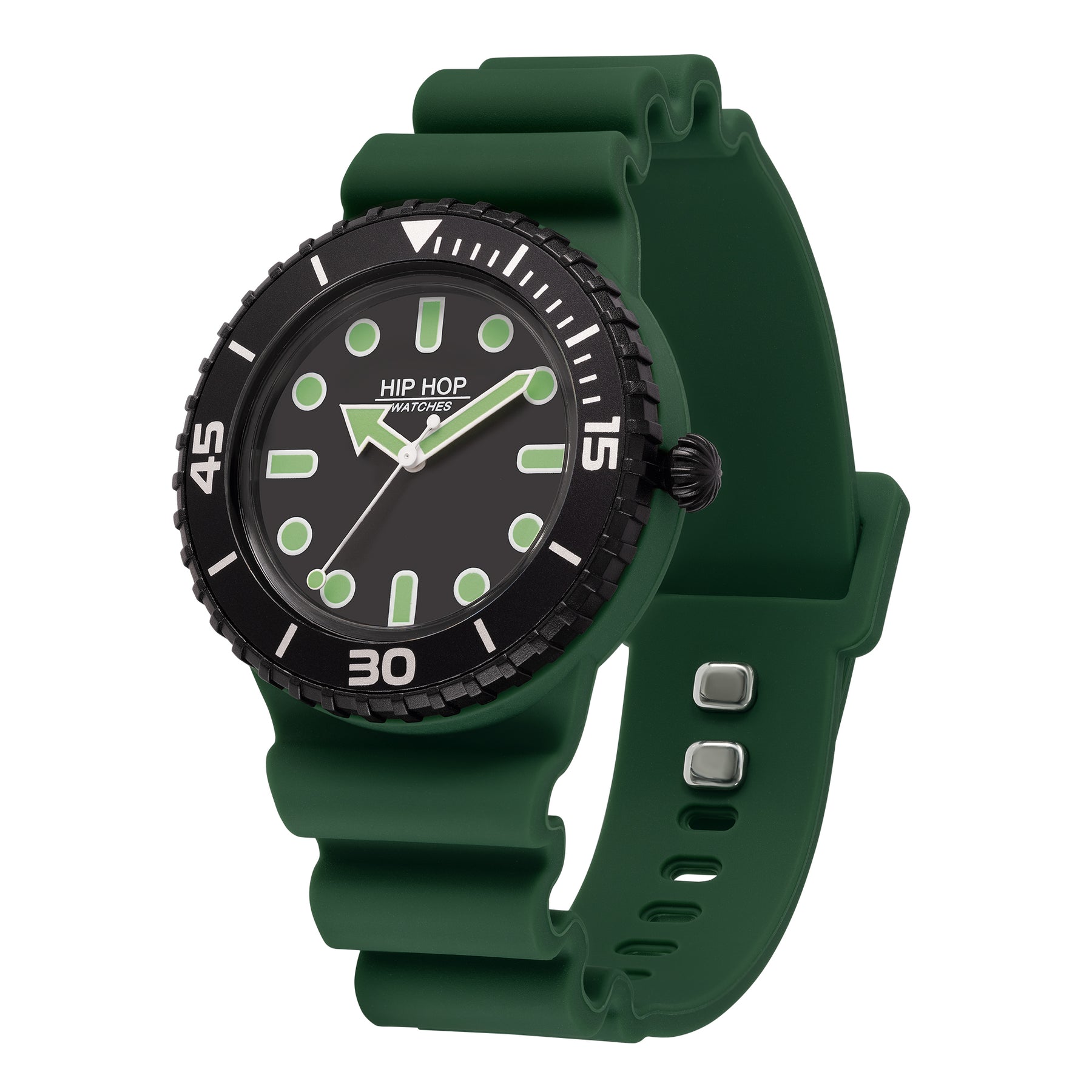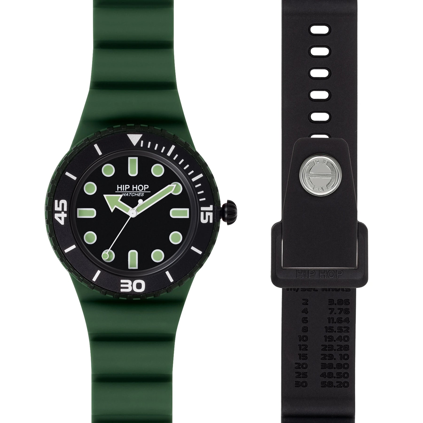 O relógio Hip Hop Master é uma mistura perfeita de estilo e praticidade, adequado para enfrentar qualquer desafio diário com energia e precisão. O mostrador é iluminado pelos números e esferas em branco luminoso contrastando com a cor da caixa e pela luneta giratória unidirecional, para uma combinação de caráter. A pulseira de silicone verde macio tem fecho .DOT e traz impresso um detalhe especial: a Velocidade do Vento, uma escala de conversão de metros por segundo em nós para indicar a velocidade do vento. O relógio é vendido com uma segunda pulseira de silicone preta intercambiável para combinar sempre com o clima do dia.